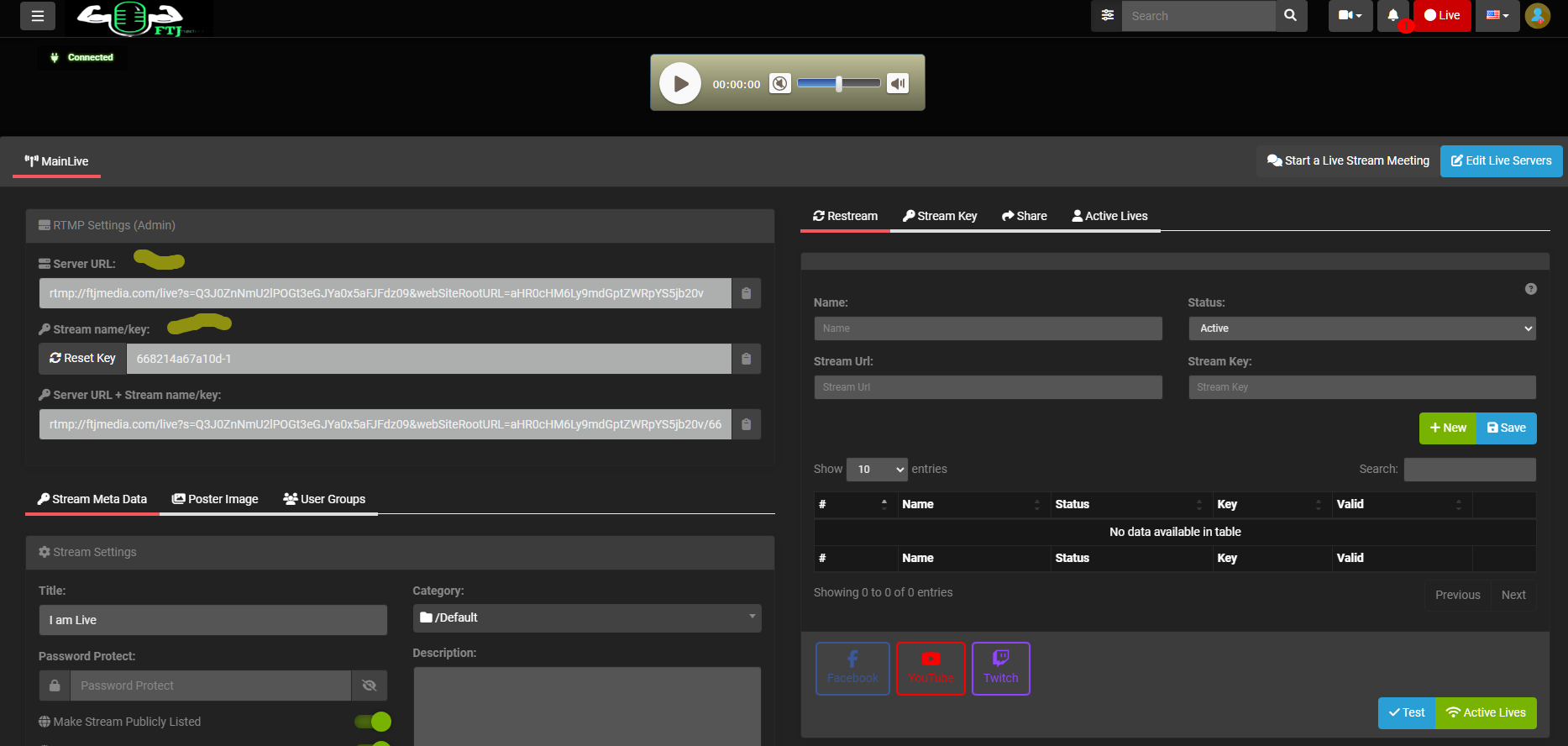 By going to https://ftjmedia.com/plugin/Live/ You will see your settings only if you are a approved uploader or streamer. You will not see this option until we approve your account, so reach out to us on Telegram or send us an email to the support team. support@ftjmedia.com