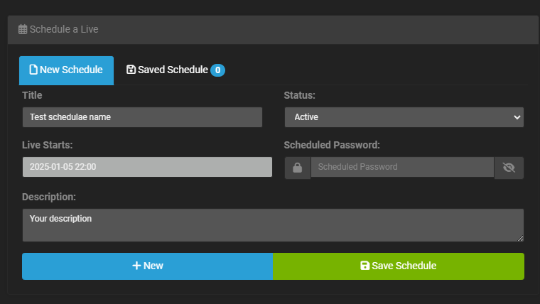 Once saved go to the Saved Schedule tab and grab your stream key and url to use for this scheduled broadcast.