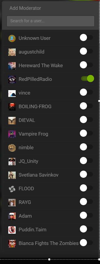 Select Moderators and a user list will appear. Just click the slider on the names you want to be moderators.